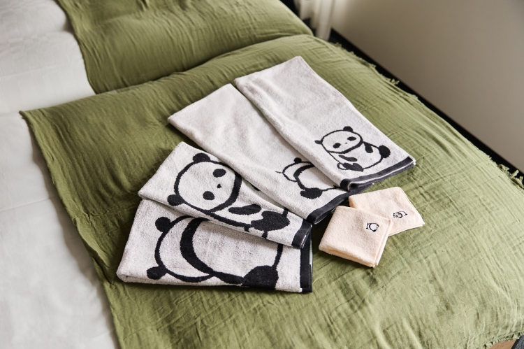 100cmのパンダ人形を中心に、サイドテーブル兼チェア、ティッシュカバー、マグカップ、シャワーカーテン、タオルに至るまで、空間を統一。