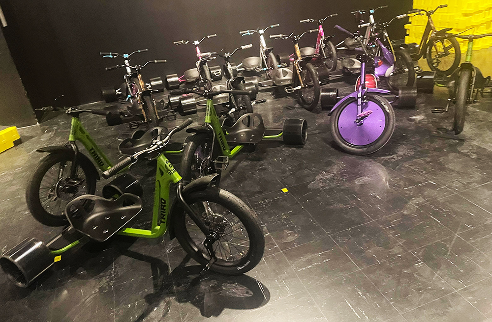 ドリフトトライクとは子供用三輪車をベースにした改造車で、三輪車の後輪を横滑りさせアクセルとハンドルでコントロールするスポーツ。ツルツル滑るフロアで、ペダルを漕いでドリフト走行をしていくので、自分の全身を使って楽しめるのが大きな魅力。乗り物好きの方は、やみつきになるスポーツです。7月12日にプレオープンを行い、既に多くのお客様よりご利用をいただいております。